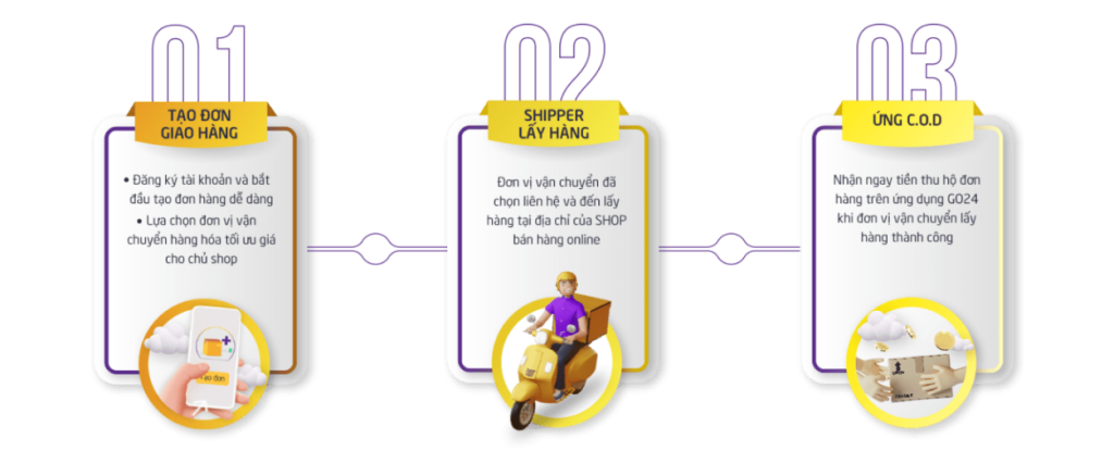 GO24 là nền tảng ứng dụng kết hợp các giải pháp Logistic - Tài chính - Thương mại điện tử đầu tiên tại Việt Nam. Nền tảng cung cấp giải pháp giúp người dùng cá nhân hoặc các đơn vị đang hoạt động kinh doanh bán hàng trực tuyến có thể tiếp cận dòng tài chính mới thông qua các tính năng “Ứng COD” hay “Điểm tín dụng" với nhiều chính sách ưu đãi hấp dẫn.